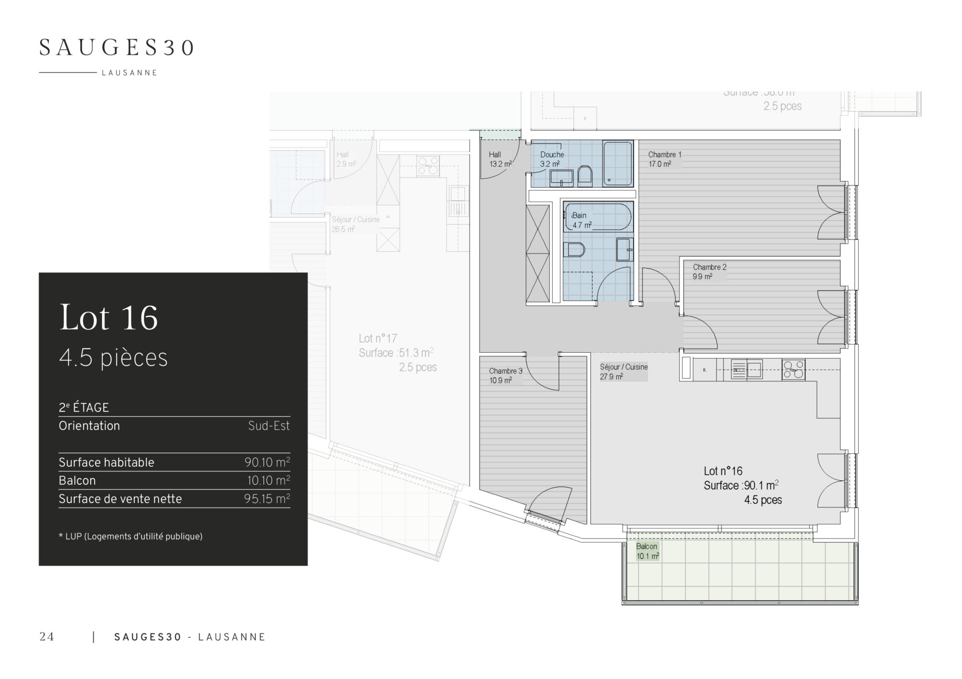 | 16 | 4.5 | 2ème | SE | 90.10 m2 | 1 | CHF 1'090'000 | |||||